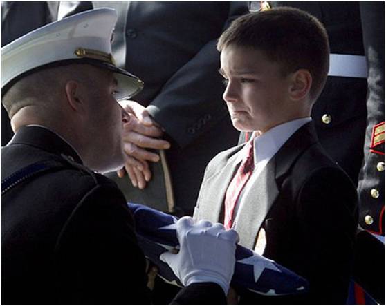 一个8岁的小男孩在父亲的葬礼上接过了国旗,父亲在伊拉克战争中阵亡。