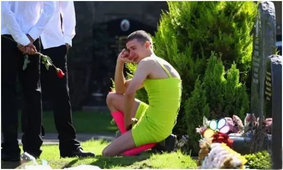 英国男子德莱尼穿这套衣服出席葬礼。死者埃利奥特,是他挚友,两人出身入死,曾约定谁先死另一人就要穿花俏裙子出席葬礼。