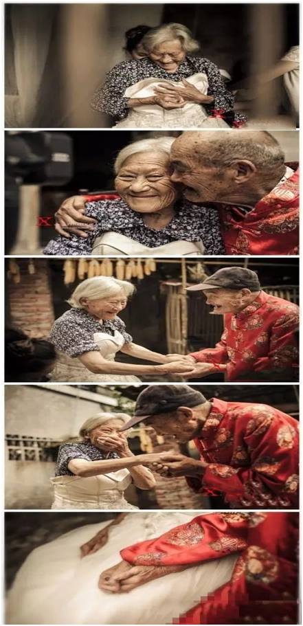 这是属于他们的婚纱照,也是第一张照片,老爷爷嘴里不停的说着老伴乖、漂亮。婆婆穿着婚纱,哭了...