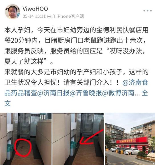 大众网·海报新闻济南5月15日讯(见习记者 解强民 秦文)5月14日,济南一位市民微博上爆料,她在市妇幼保健院旁边的金德利民快餐店就餐时,发现一只老鼠在厨房门口跑进跑出十余次,跟服务员反映,服务员给出的回应是“哎呀没办法,夏天了就这样”。