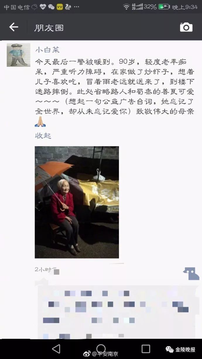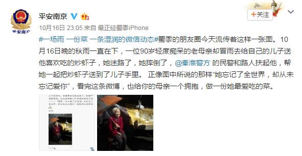 今天最后一警被暖到。90岁,轻度阿尔茨海默病,严重听力障碍,在家做了炒虾子,想着儿子喜欢吃,冒着雨老远就送来了,到楼下迷路摔倒。此处省略路人和蜀黍的善良可爱(想起一句公益广告台词,她忘记了全世界,却从未忘记爱你。)致敬伟大的母亲!