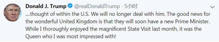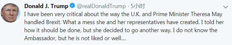 “我一直对英国首相特雷莎·梅处理英国脱欧的方式持批评态度。她和她的代表们把局面搞得一团糟。我已经告诉了她应该怎么做,但她决定走另一条路。”特朗普首先写道。