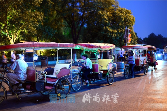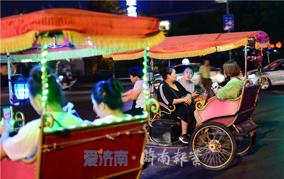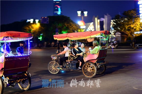 22日,在大明湖西南门前,十多辆样式统一的电动三轮车,搭载着外地游客往返于景区与老城区之间。每辆三轮车都安装了装饰彩灯,五彩的灯光在夜幕里成为流动的风景,不少游客乘坐时自拍发朋友圈,三轮车也逐渐成了网红打开地。据了解,驾驶电动三轮车的多是中年人,也有65岁的老年人,他们只在晚上8点以后开始出现在老城区周边,外地游客乘坐的费用也比出租车高,从大明湖西南门到趵突泉单人收费15元,人多的时候要翻倍。