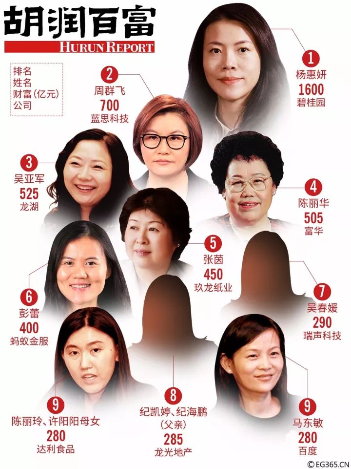 具体来看,36岁的杨惠妍以财富1600亿元继2014年之后第五次成为中国女首富;“触屏女王”46岁周群飞以700亿元排名第二,也是第二次成为全球白手起家女首富。据了解,近一年来,周群飞的个人财富涨了250亿,平均一个星期涨近5亿。另外,前女首富53岁吴亚军以525亿元排名第三;去年女首富76岁陈丽华以505亿元居第四。