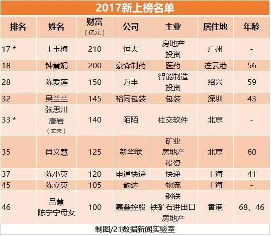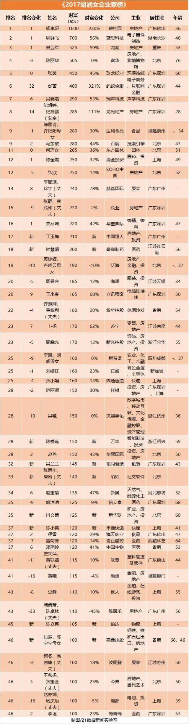 从年龄层来看,上榜女富豪平均年龄49岁,比去年大1岁,而比百富榜总榜平均年龄小5岁。