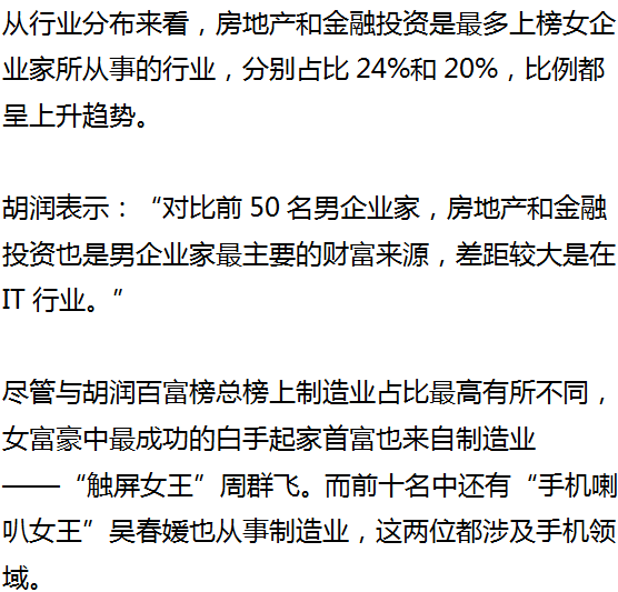 从财富获取来看,前50位上榜女富豪中,白手起家的有34位,占了68%,比去年多2位。他们或是自己白手创业,如富华的陈丽华、蓝思科技的周群飞、龙湖的吴亚军和玖龙纸业的张茵等,或是与丈夫共同创业,如百度的马东敏、SOHO中国的张欣、圆通速递的张小娟和汉鼎的吴艳等。