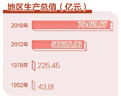 新中国成立70年来,齐鲁儿女始终与时代同步、与祖国同行,齐鲁大地经济社会发生了翻天覆地的变化。现在,山东1天创造的财富相当于1952年全年的4.8倍。山东以全国1.6%的土地,创造了全国8.5%的经济总量、9.5%的工业增加值和8.3%的农业产值。随着工业体系不断完善、优势产业集聚发展,山东成为全国重要的化工、建材、医药、装备制造生产基地,工业增加值由1952年的6.8亿元提高到2018年的2.89万亿元。