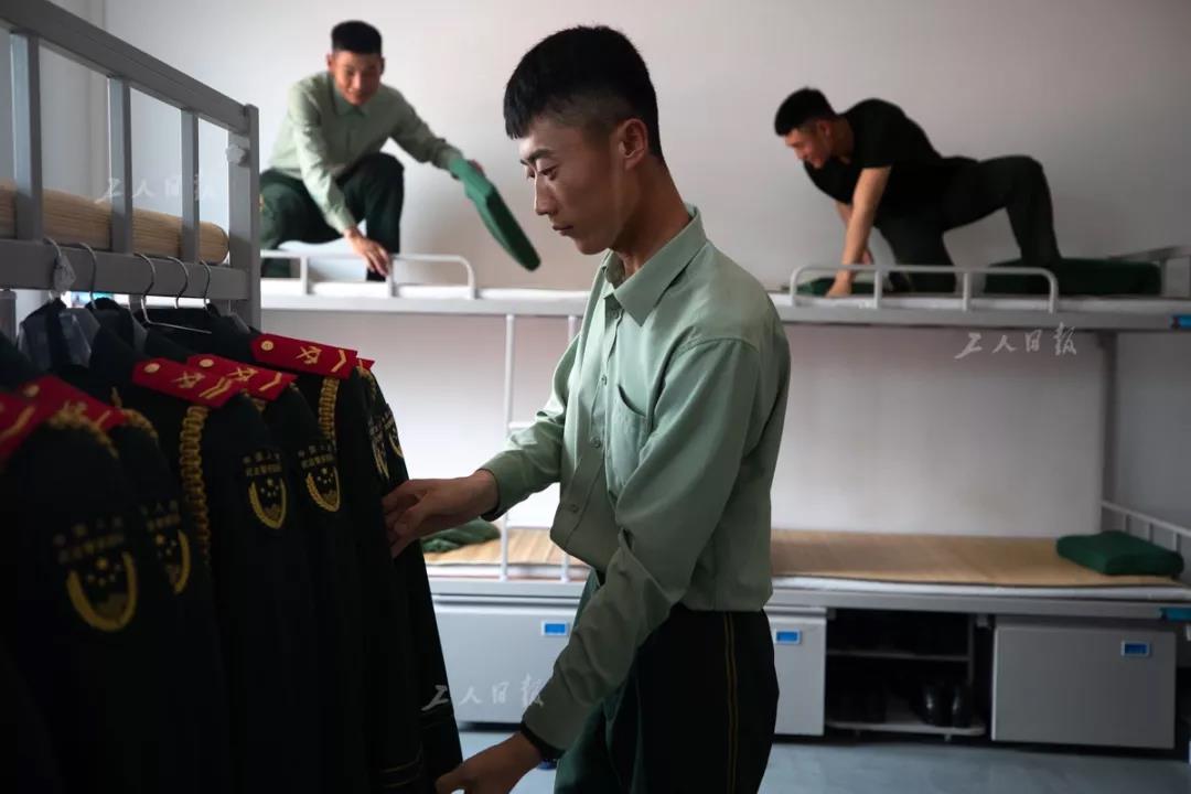 ↑午休前,武警方队的一名战士正在整理训练时的军装。