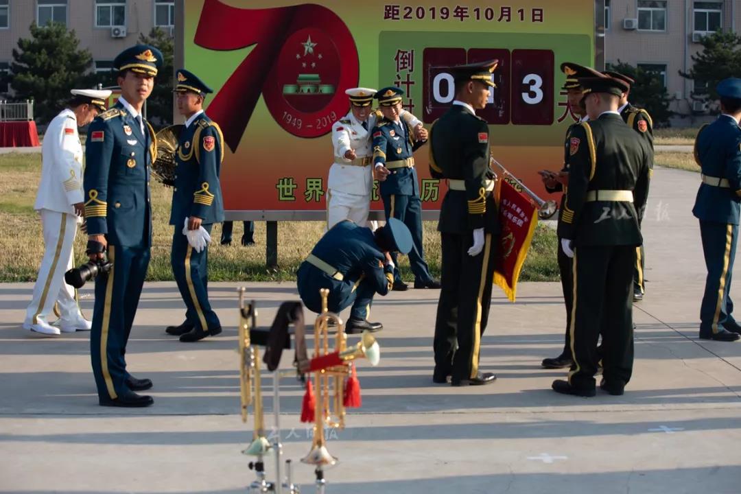 ↑9月17日下午,距国庆阅兵还有13天的时间,军乐团的乐手们利用休息时间在倒计时牌前合影留念。