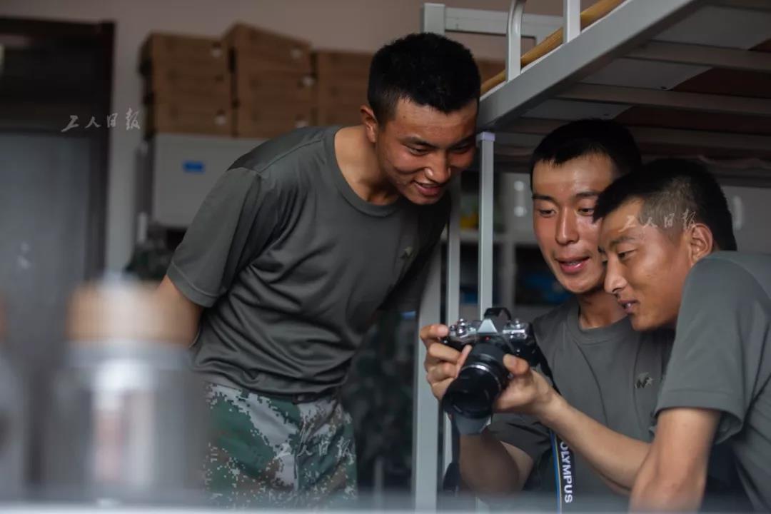 ↑回到宿舍后,一名喜爱摄影的战士正在给战友们分享自己拍摄的照片。