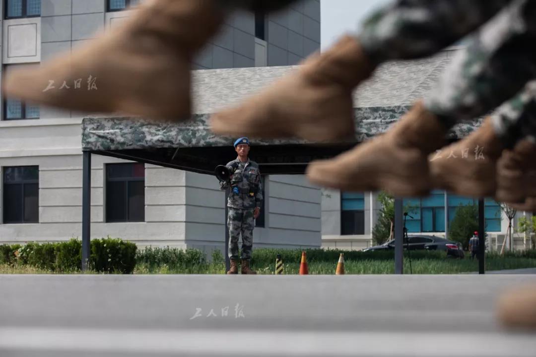 ↑维和部队方队的战士们正在教官的口令下练习踢正步,他们是从维和待命部队抽组来的。