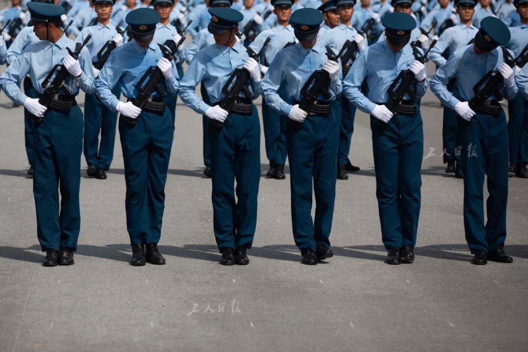 ↑训练中的仪仗方队空军战士。此次阅兵中,徒步方队的男性身高普遍在1.75米至1.85米之间。
