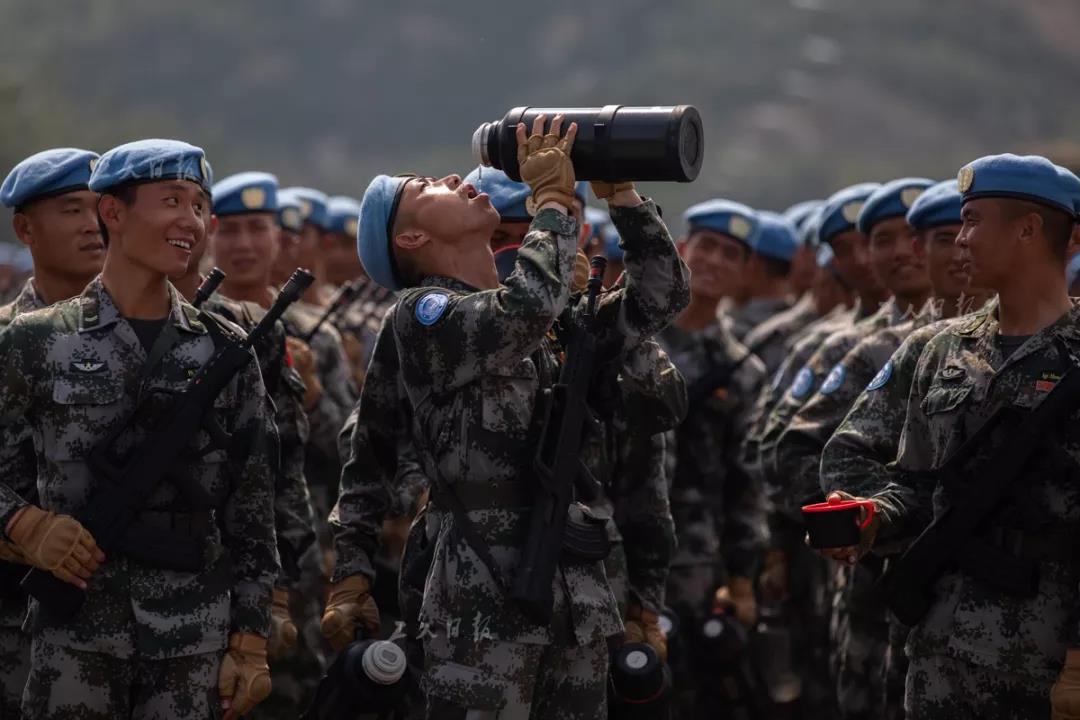 ↑一名维和部队方队的战士正在补水降温,他们训练中每天需要补充1升多的水。