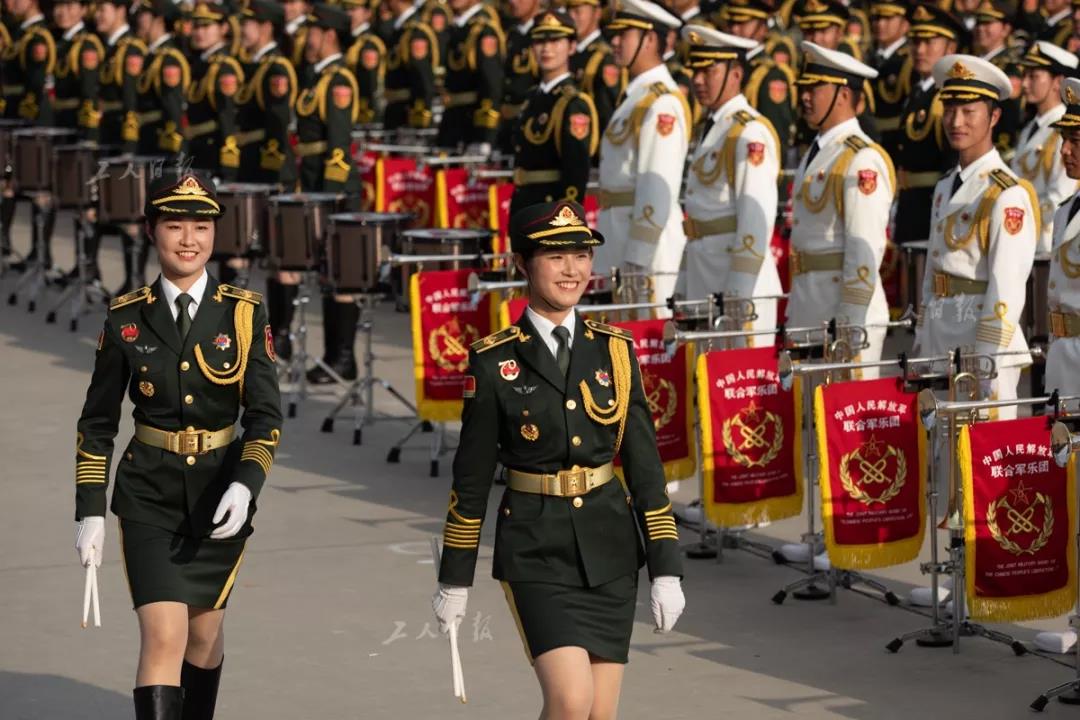 ↑联合军乐团里的一对双胞胎姐妹,她们都是乐团的鼓手。本次联合军乐团以解放军军乐团为主,从全军抽组1300多人组成。