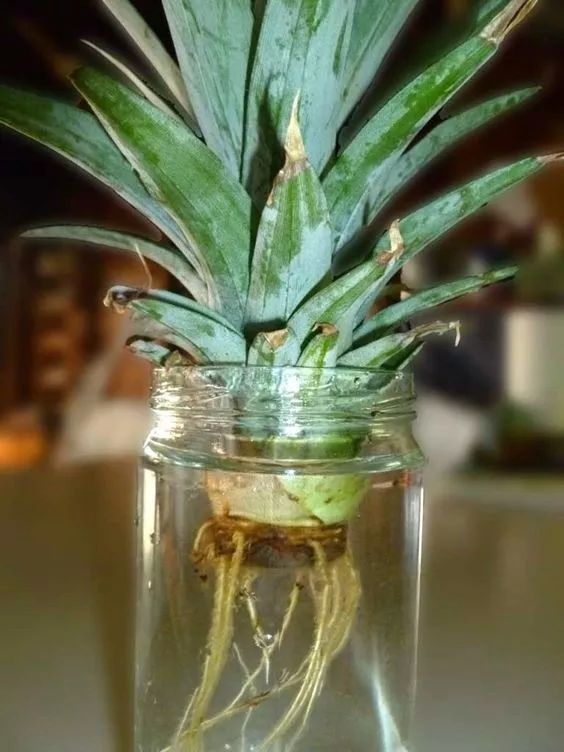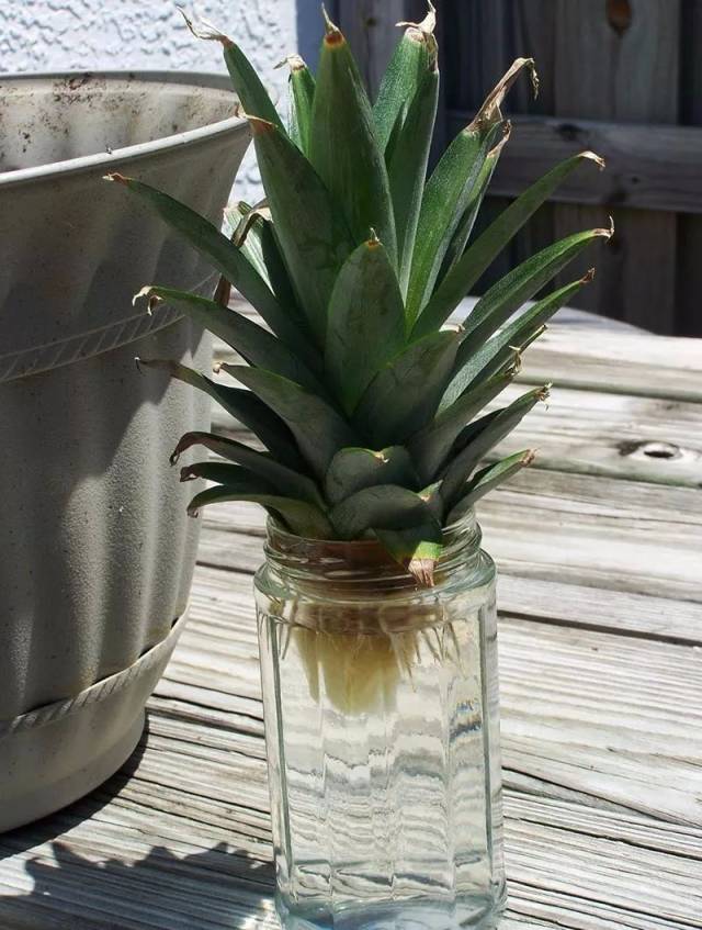 3. 可以放置在透明的玻璃瓶中当水培盆栽,或者移植到土壤中,菠萝植株会越长越大棵哦~