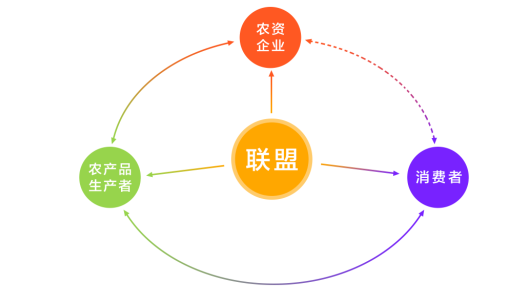 生态农业产业联盟,分为三层:第一层是农资企业,生物肥、有机肥、农药,每个类别选择两到三家企业成为联盟成员;中间一层是生产者,这包括种植大户,专业合作社,农联站长;最后一层是终端消费者,这是一个闭环的农业生态链。
