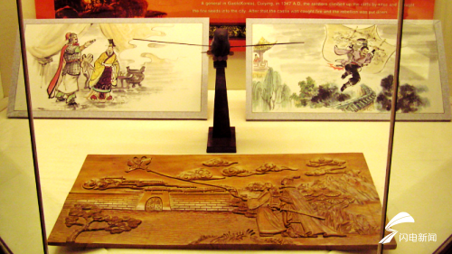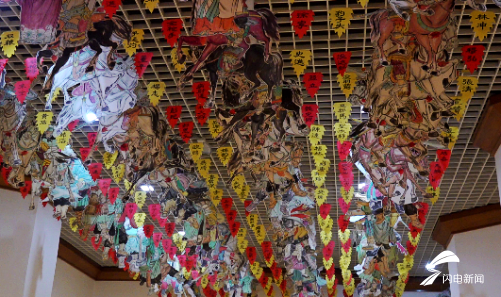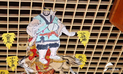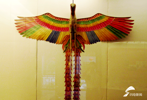 在展馆中,闪电新闻记者看到了屋顶上空悬挂着一只大型风筝,上面写着“梁山好汉一百单八将”。据王培培介绍,这只风筝是该博物馆中最长的风筝,长度220米,必须由五六个人一起合作才能放飞上天。它在1985年国际风筝会比赛获得了串式类风筝第二名的好成绩。