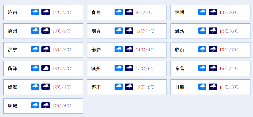 今天白天到夜间,全省天气阴,鲁东南、鲁中和半岛地区有小到中雨,其他地区有小雨。鲁西北的东部、鲁中的北部和半岛地区南风3~4级转北风4~5级阵风6级,其他地区南风转北风3~4级。夜间最低气温:鲁西北的东部地区4℃左右,鲁东南地区8℃左右,其他地区6℃左右。