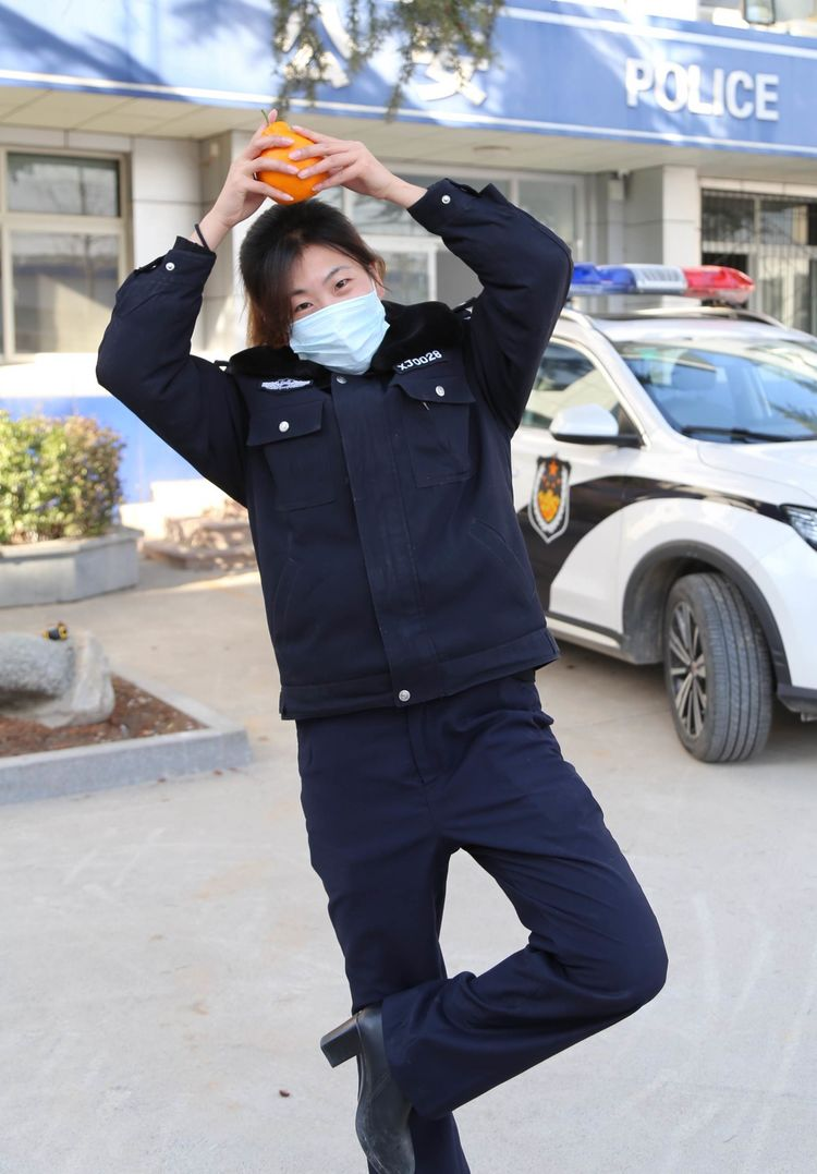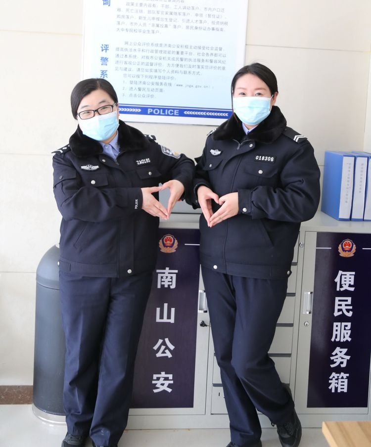 李春蕾和张丽是西营派出所户籍室的搭档,李春蕾2008年就来到西营派出所,在所里已经工作13年了,户籍业务非常熟练,是一个让群众满意的“老辅警”。张丽是李春蕾的搭档,工作之余她喜欢拍抖音。他们商量着:我们摆什么动作呢?比个心吧。