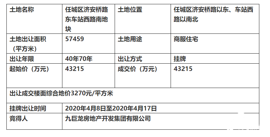该地块位于任城区济安桥路以东、车站西路以南北,土地面积57459m²,土地用途为商服住宅用地,出让年限:商服为40年,住宅为70年。拍卖起始价为43215万元,出让成交楼面综合地价为3270元/㎡,最终被九巨龙房地产开发集团有限公司底价竞得。