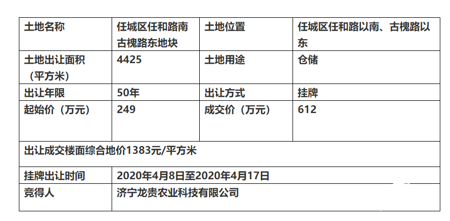 该地块位于任城区任和路以南、古槐路以东,土地面积4425m²,土地用途为仓储用地,出让年限为50年。拍卖起始价为249万元,出让成交楼面综合地价为1383元/㎡,经过多轮竞价,该地块最终被济宁龙贵农业科技有限公司以612万元的价格成功竞得。
