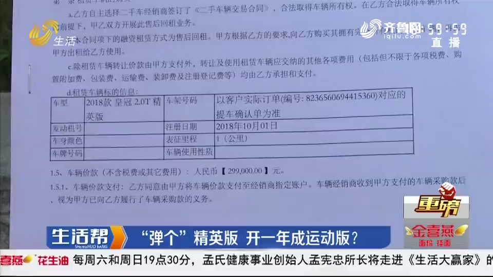 为了解决问题,记者和朱女士来到了潍坊联达名车行总店,店的门头和店内都有不少“弹个车”的广告元素。潍坊联达名车行总店王经理表示,朱女士当初从店里提走的车,是“弹个车”提供的车源,协议也是和“弹个车”的母公司浙江大搜车融资租赁有限公司签的。他们只负责给“弹个车”提供销售、交车和挂牌等服务,至于车型还得看当时签订的协议才行。王经理看了朱女士的协议后表示,既然上面已经写明了车型是2018款皇冠2.0T精英版,那朱女士提的车应该是精英版的。随后朱女士又拿出了4S店开具的证明,王经理表示这个证明他不能做评判,只能以试车为准。