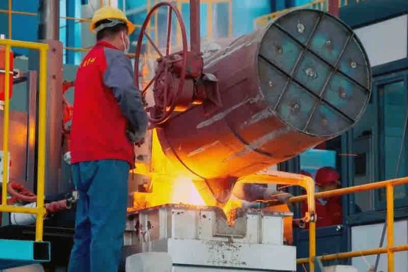 5月12日,在兰陵县装备智造小镇,山东德鹏金属科技有限公司的厂房内,工人们站在操作台上严阵以待,一罐高温铁水即将在全自动生产线上被加工成螺纹管件。