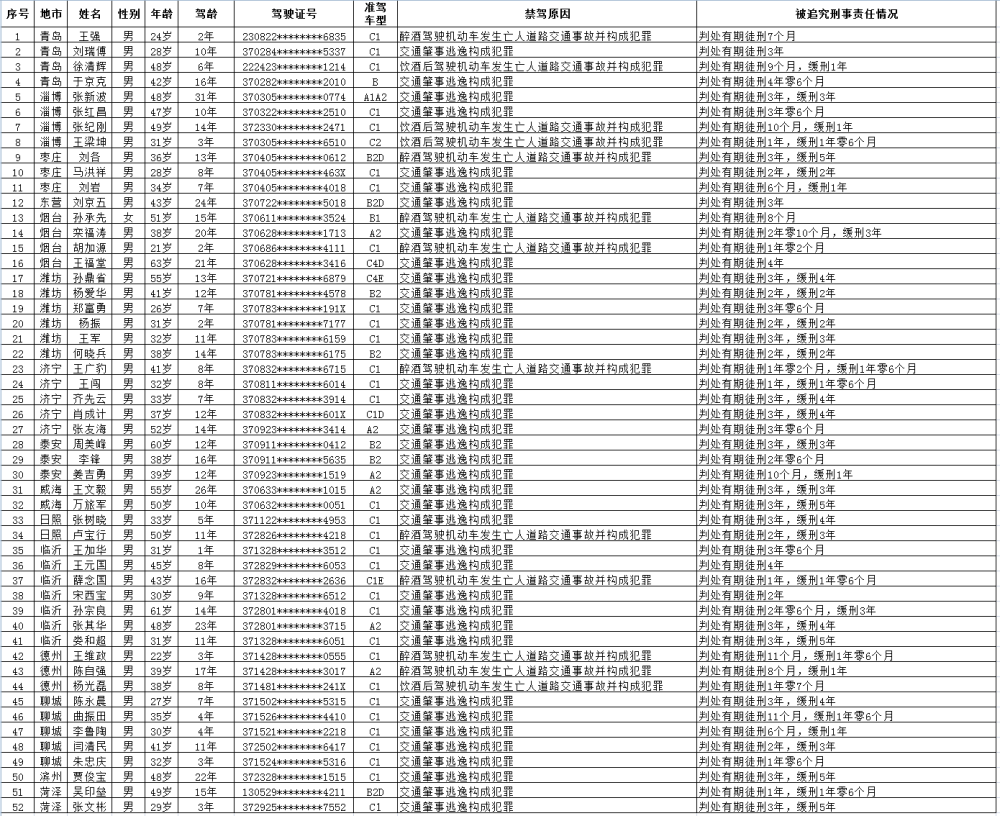 >>20日,山东省公安厅交通管理局发布2020年第四批全省终生禁驾人员名单,共52名。其中驾龄最少的只有一年,年龄最小的只有21岁。详情
