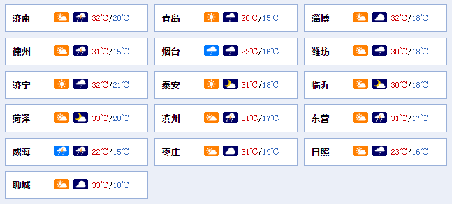 >>23日白天到夜间,鲁西北的东部、鲁中、鲁东南和半岛地区天气阴有雷雨或阵雨,局部地区有冰雹;其他地区天气多云。南风转北风,半岛地区4~5级阵风6级,其他地区3~4级,雷雨地区雷雨时阵风7~9级。夜间最低气温:鲁南地区18℃左右,其他地区14℃左右。最高气温:鲁西南地区35℃左右,鲁中山区和半岛内陆地区27℃左右,沿海地区22℃左右,其他地区31℃左右。