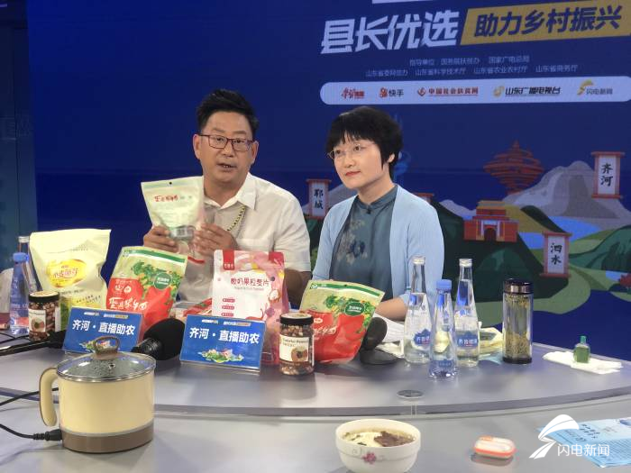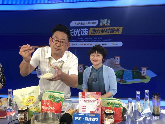 齐鲁网·闪电新闻7月2日讯 7月1日,“百城县长 直播助农”山东专场直播活动走进德州齐河,齐河县人民政府副县长王炜化身主播,与山东广播电视台好物优选官孙亮一起在直播间向全国网友推介当地好物和美食,为当地农产品打Call。