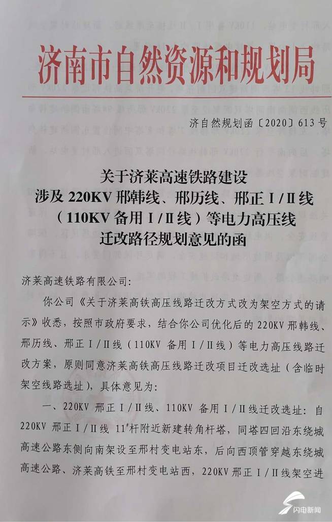另外,在这份济南市自然资源和规划局致济南轨道交通集团有限公司子公司济莱高速铁路有限公司的函中,还要求供电线路临时架空位置应尽量远离周边居民区,保障公园以及周边用地和设施安全,满足环保部门要求,且不得影响高速公路、周边道路改扩建工程的实施。关于入地方面,该函还特别说明,待条件成熟后,应逐步将临时架空高压线入地敷设。