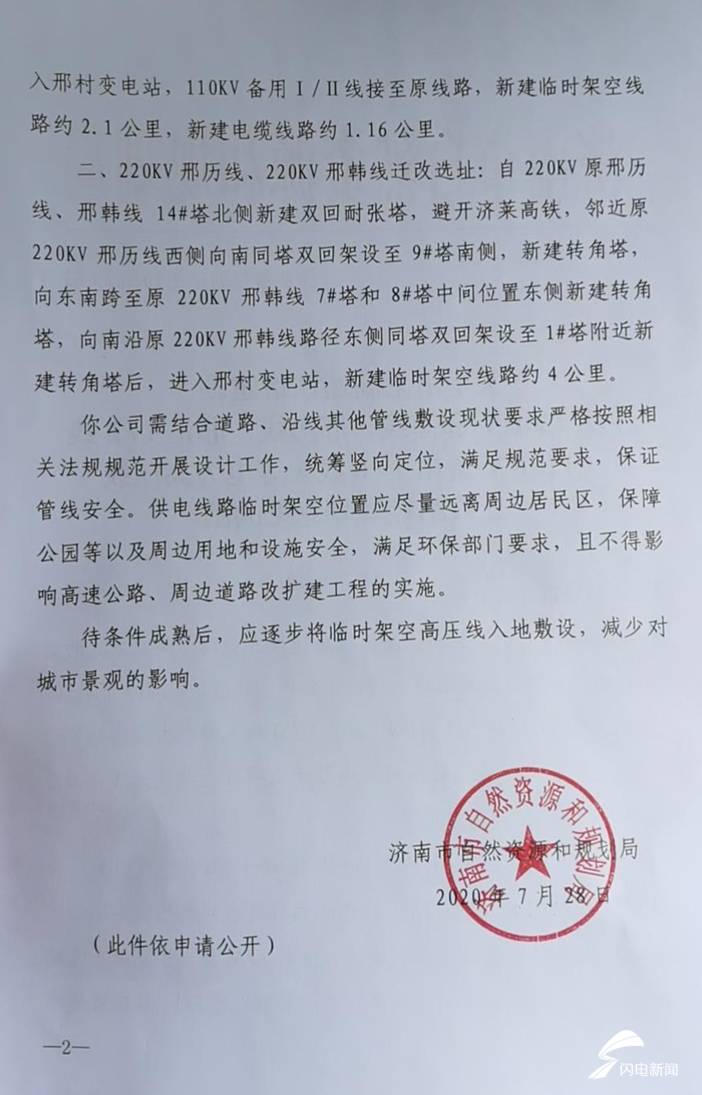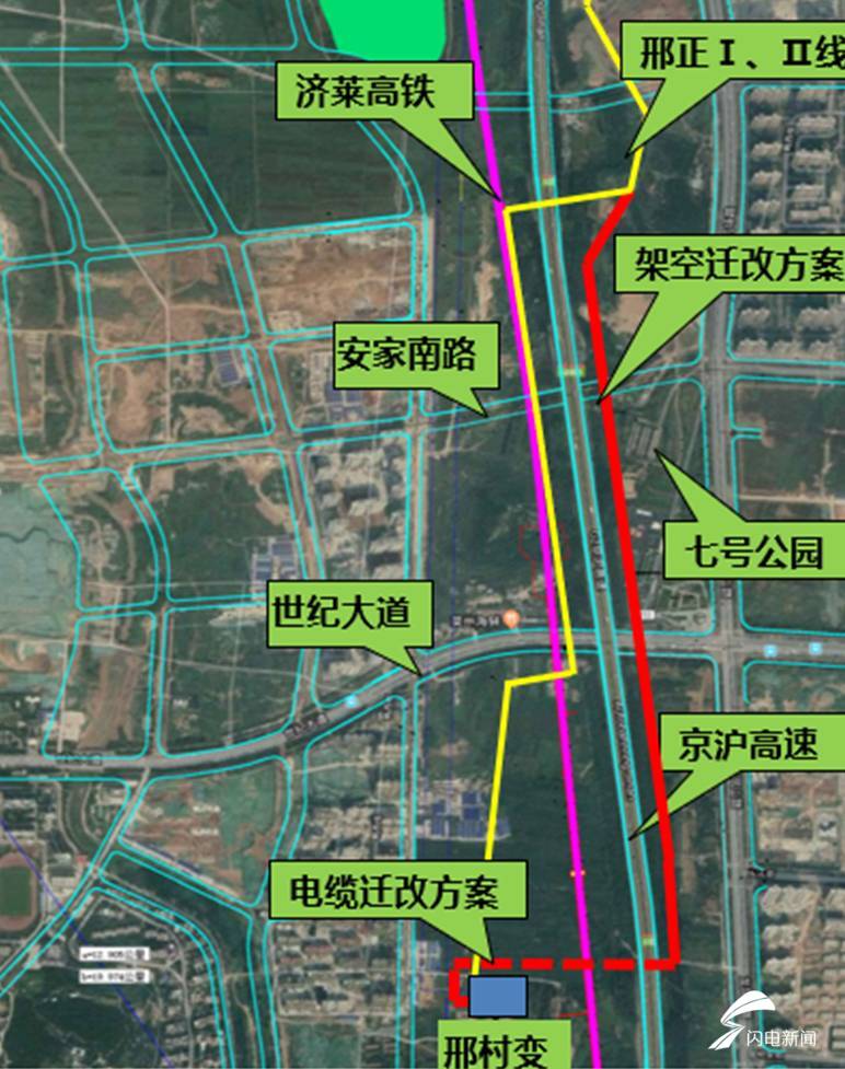 闪电新闻记者在济南市生态环境局网站上看到,济南市生态环境局7月30日受理了济莱高速铁路有限公司济莱高铁高压线路220kV邢正I/II线、110kV备用I/II线迁改工程环境影响评价报告表。受理材料中包含了7月28日济南市自然资源和规划局致济南轨道交通集团有限公司子公司济莱高速铁路有限公司的函:《关于济莱高速铁路涉及220kV邢韩线、邢历线、邢正I/II线(110kV备用I/II线)等迁改路径规划的函》。函中说明了邢正线迁改后临时架空高压线的选址规划:自220kV邢正I/II线11杆附近新建转角杆塔,同塔四回沿东绕城高速公路东侧向南架设至邢村变电站东,后向西顶管穿越东绕城高速公路、济莱高铁至邢村变电站西,220kV邢正I/II线架空进入邢村变电站,110kV备用I/II线接至原线路,新建临时架空线路2.1公里,新建电缆线路约1.16公里。