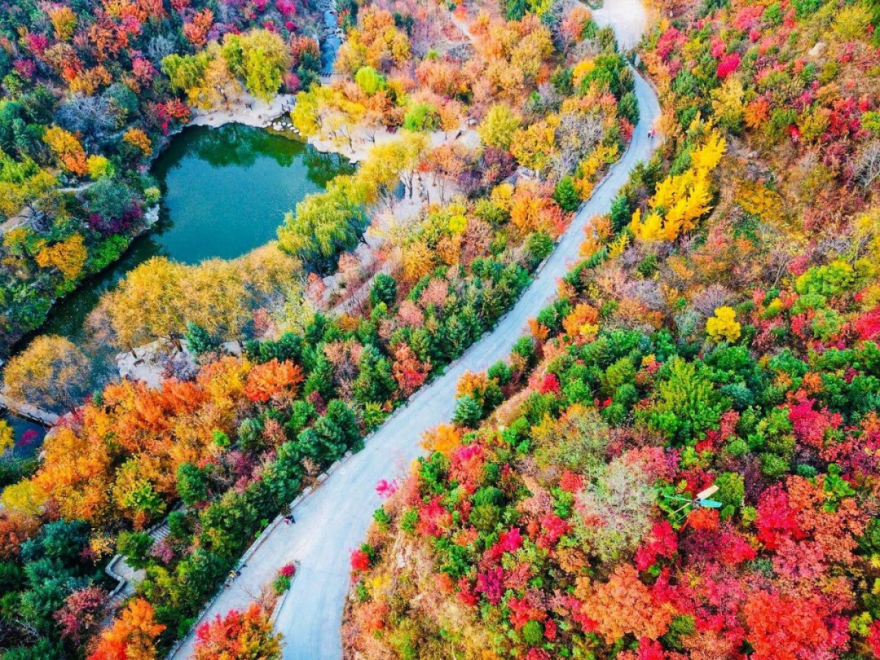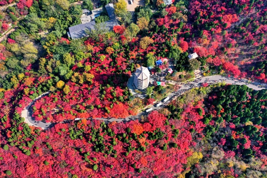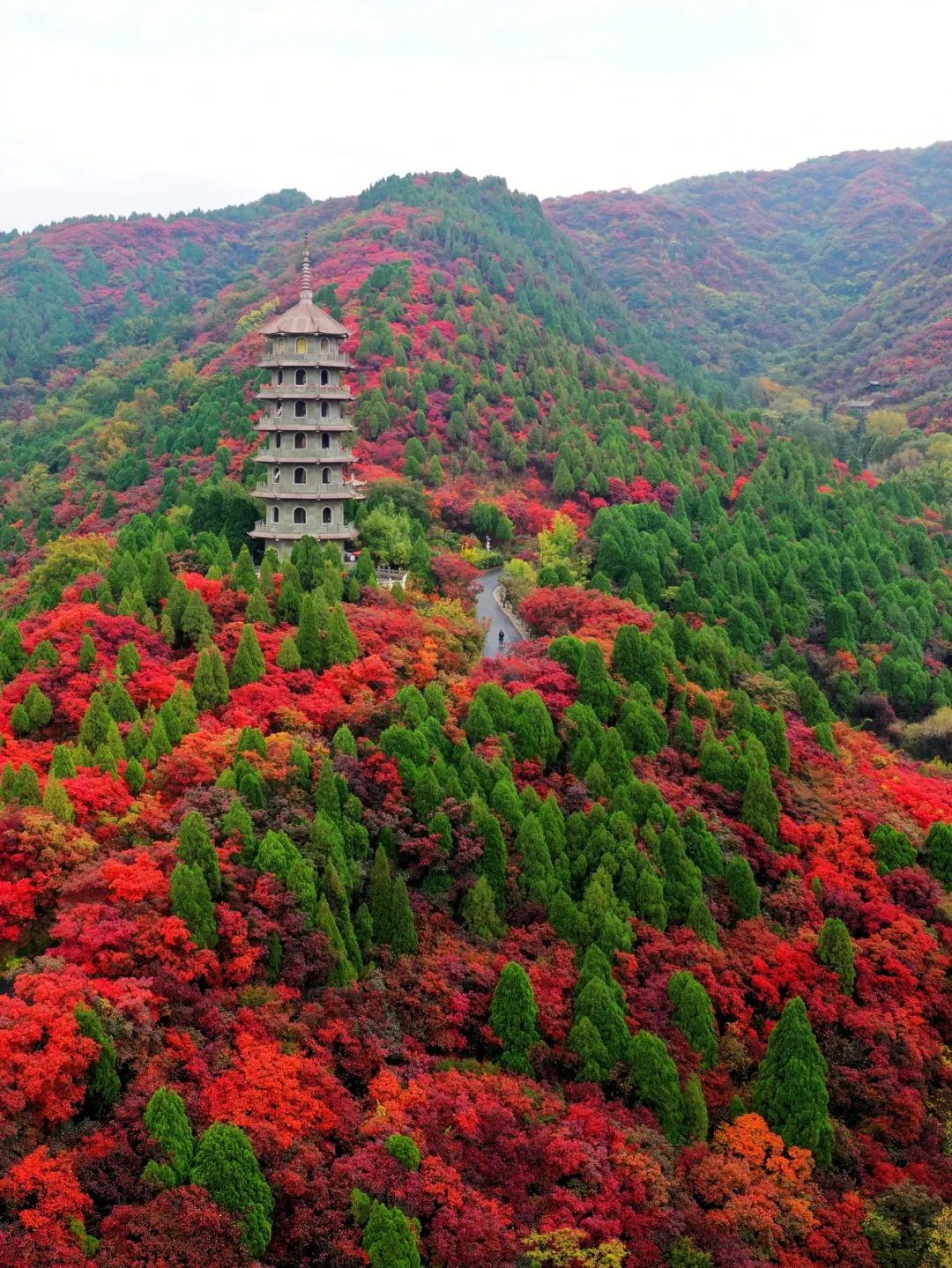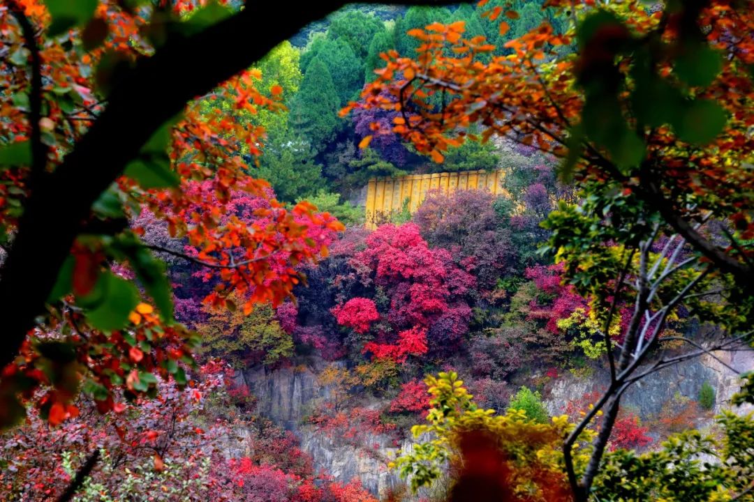 秋天一到,九顶塔的风景仿佛被大自然打翻了调色盘,各种植物的叶子,全部在秋风的照拂中变成了娇艳的暖色。