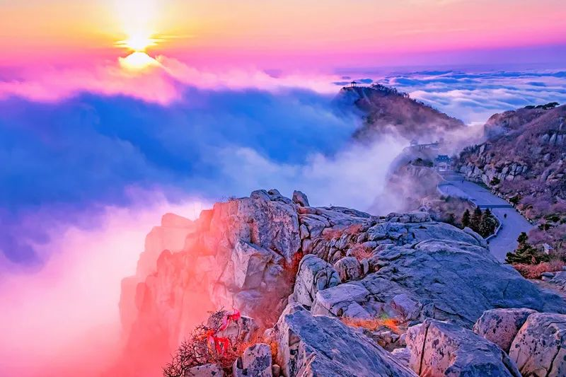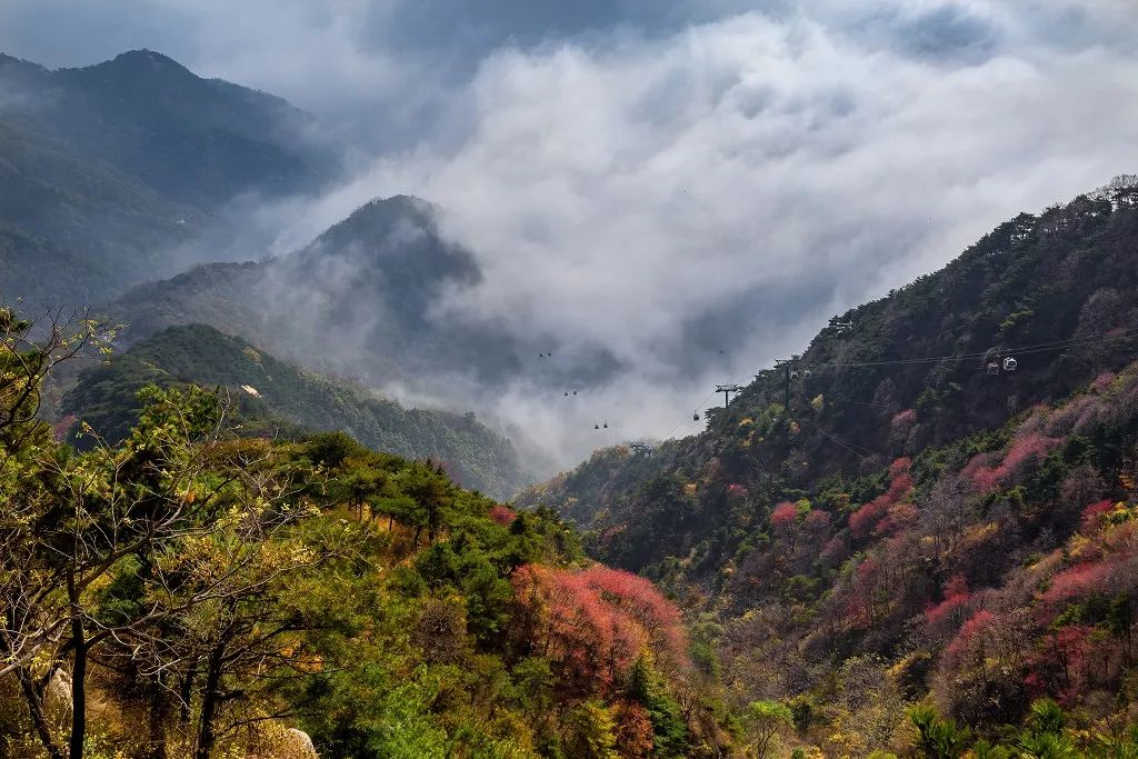 蓝天白云下,泰山云海之间的红叶,在阳光的沐浴下,五彩斑斓,堪比那娇艳的夏花。
