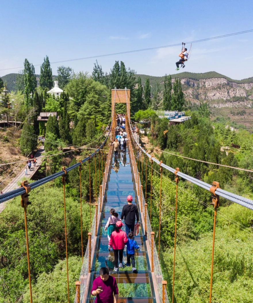 风和日丽之时,踏在九顶塔中华民俗乐园的玻璃桥上,美景尽收眼底,行走其上彷如御风而行,惊险无比,要的就是这“心跳”的感觉!