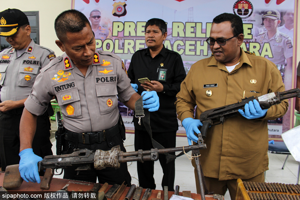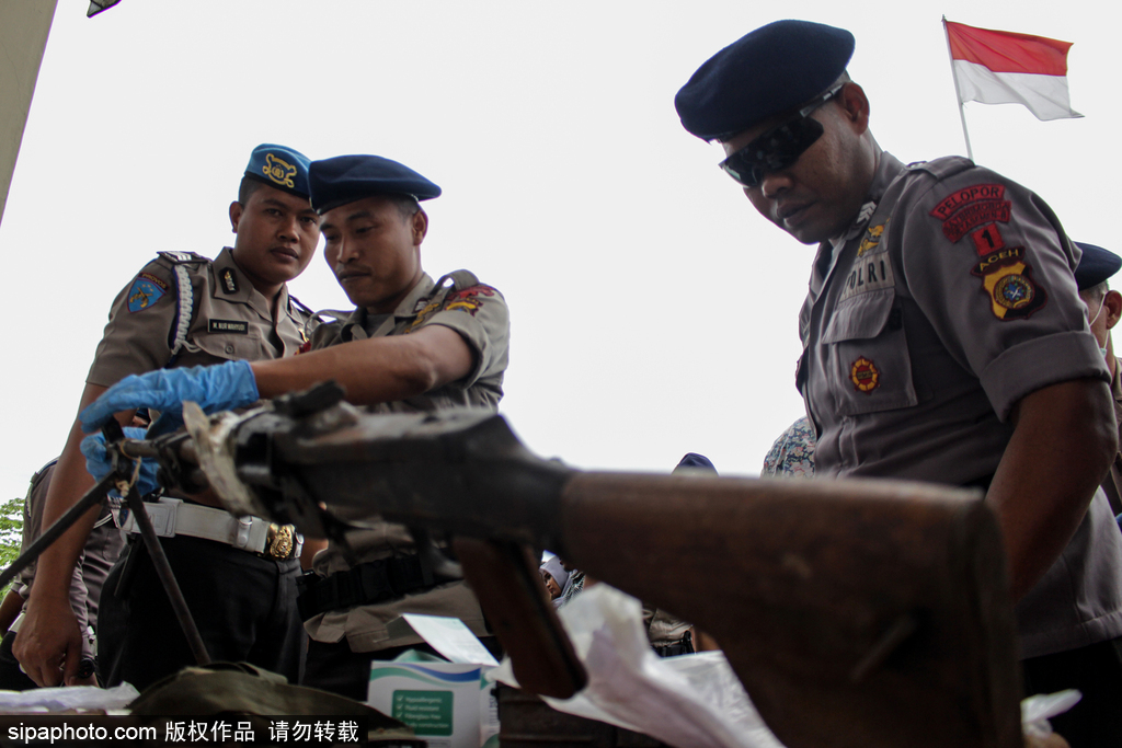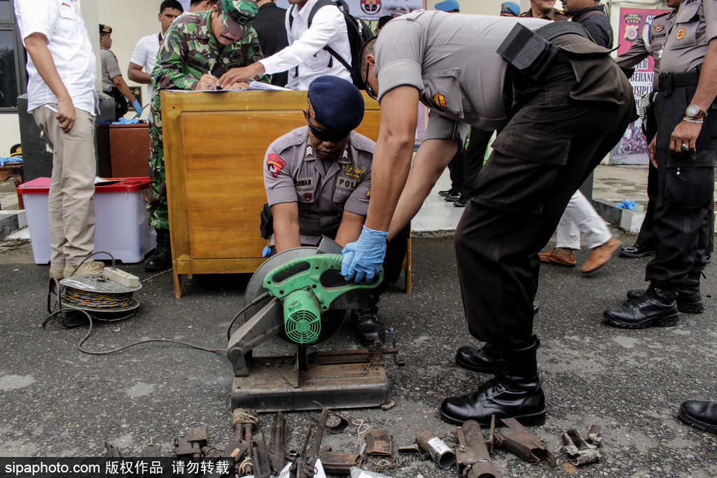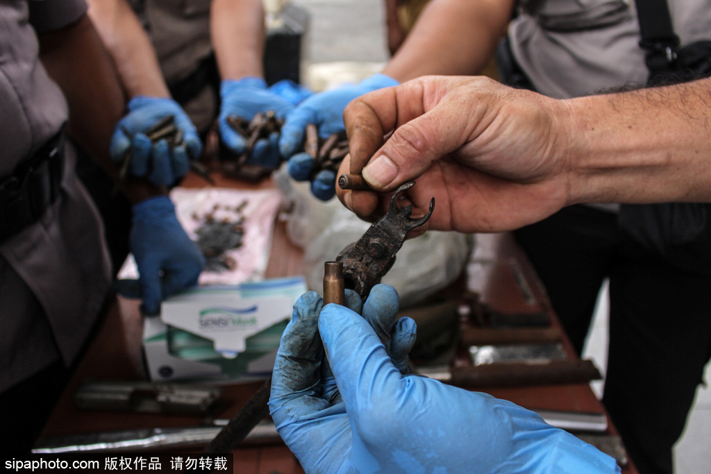 当地时间2018年1月9日,印度尼西亚北亚齐,印尼警察展示销毁从犯罪团伙缴获的14支枪械及数千发子弹。
