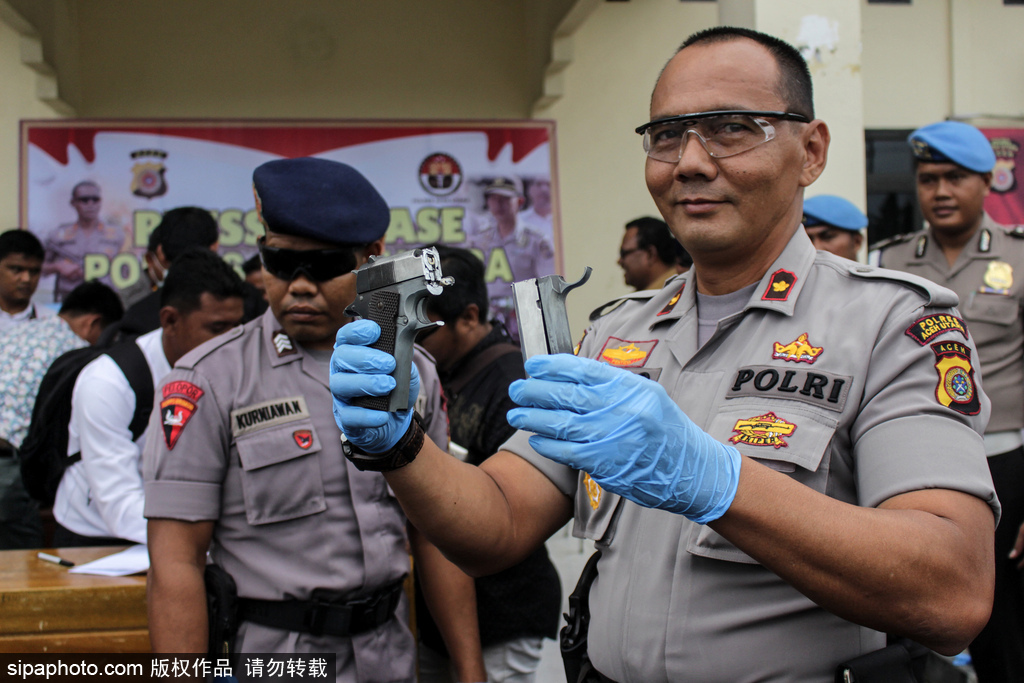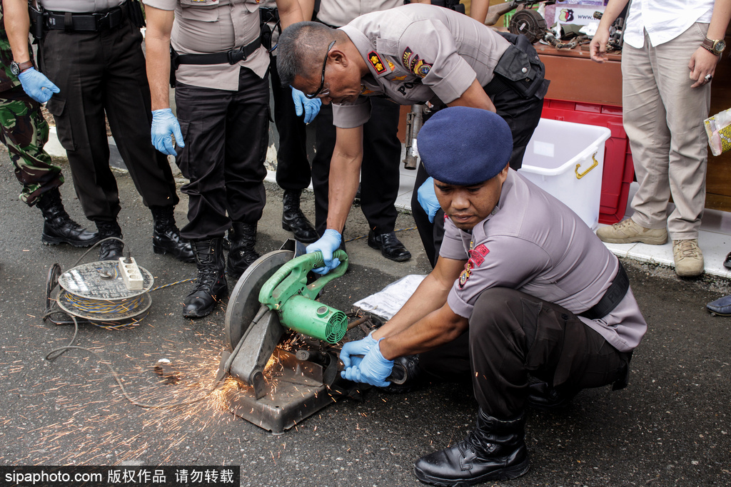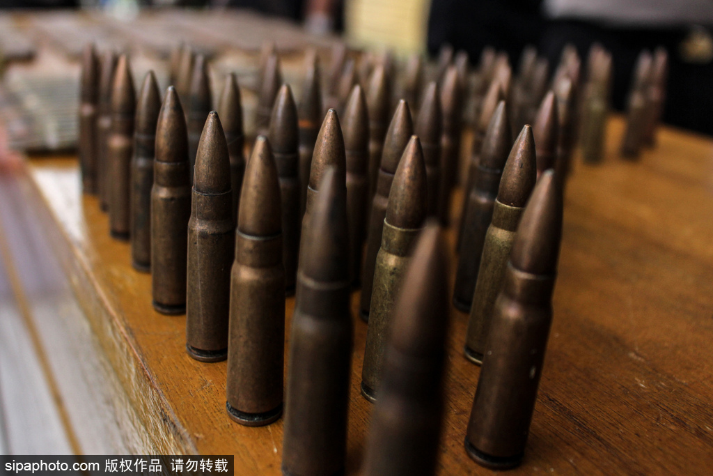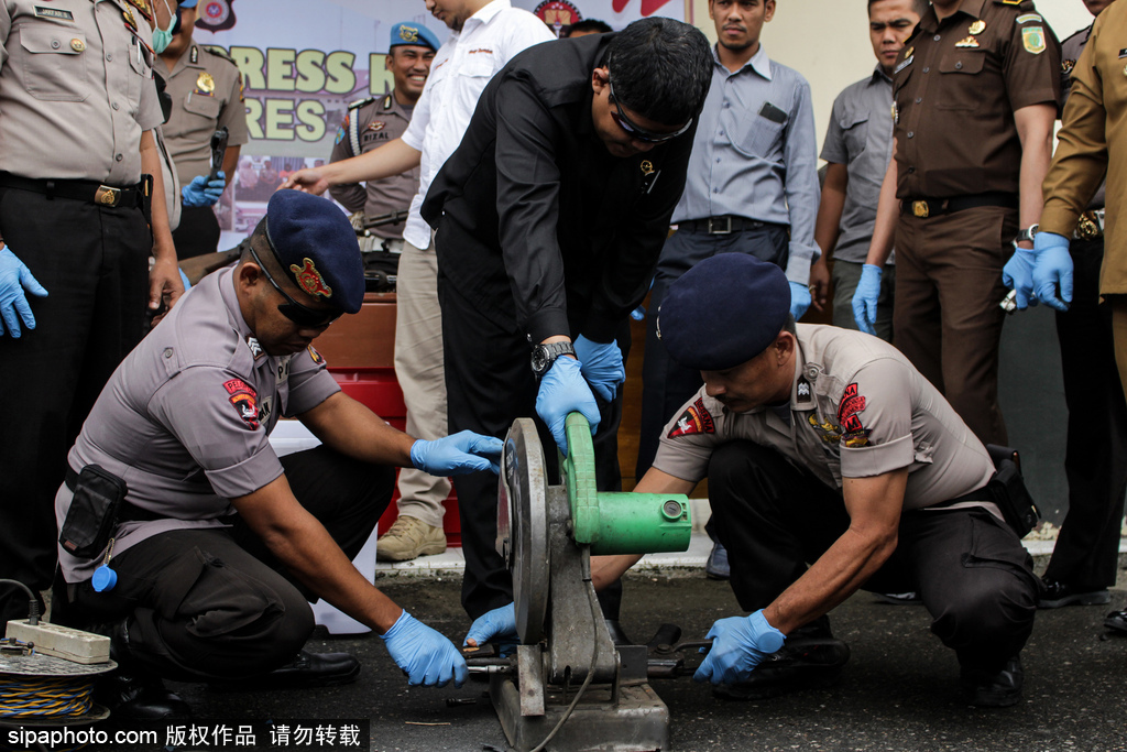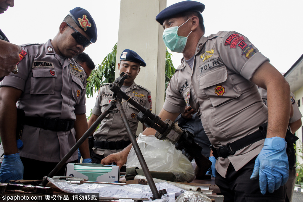 当地时间2018年1月9日,印度尼西亚北亚齐,印尼警察展示销毁从犯罪团伙缴获的14支枪械及数千发子弹。
