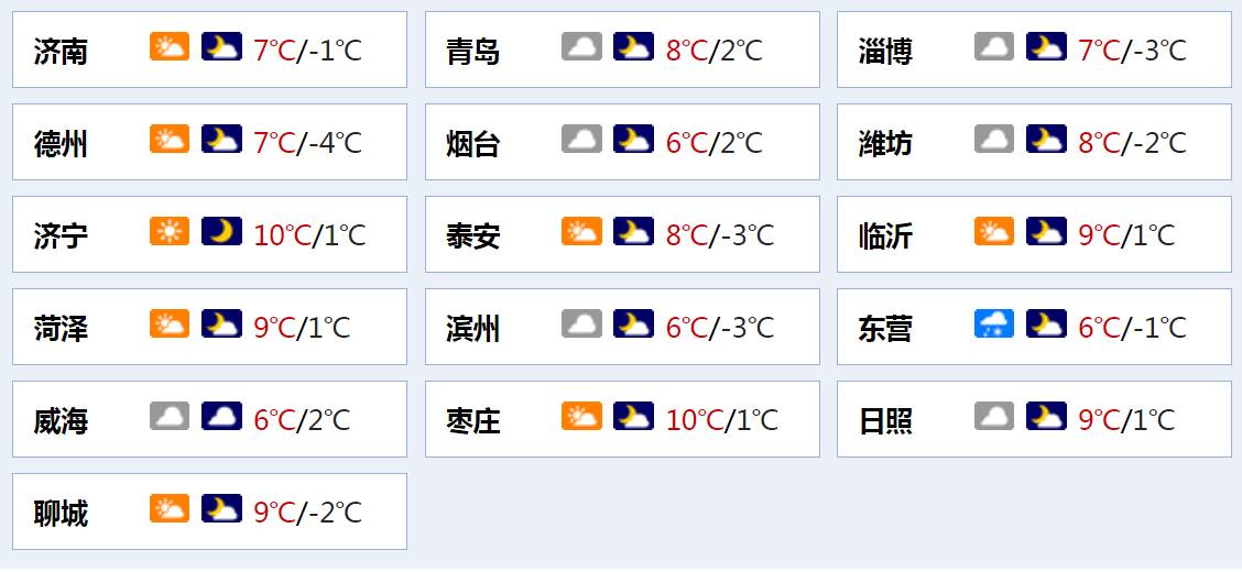 今天白天到夜间,鲁西北的东部和半岛北部地区天气阴局部有小雨雪,其他地区天气多云。北风,半岛地区4~5级阵风6~7级,其他地区3~4级。夜间最低气温:鲁西北、鲁中山区和半岛内陆地区-3℃左右,半岛沿海地区3℃左右,其他地区0℃左右。