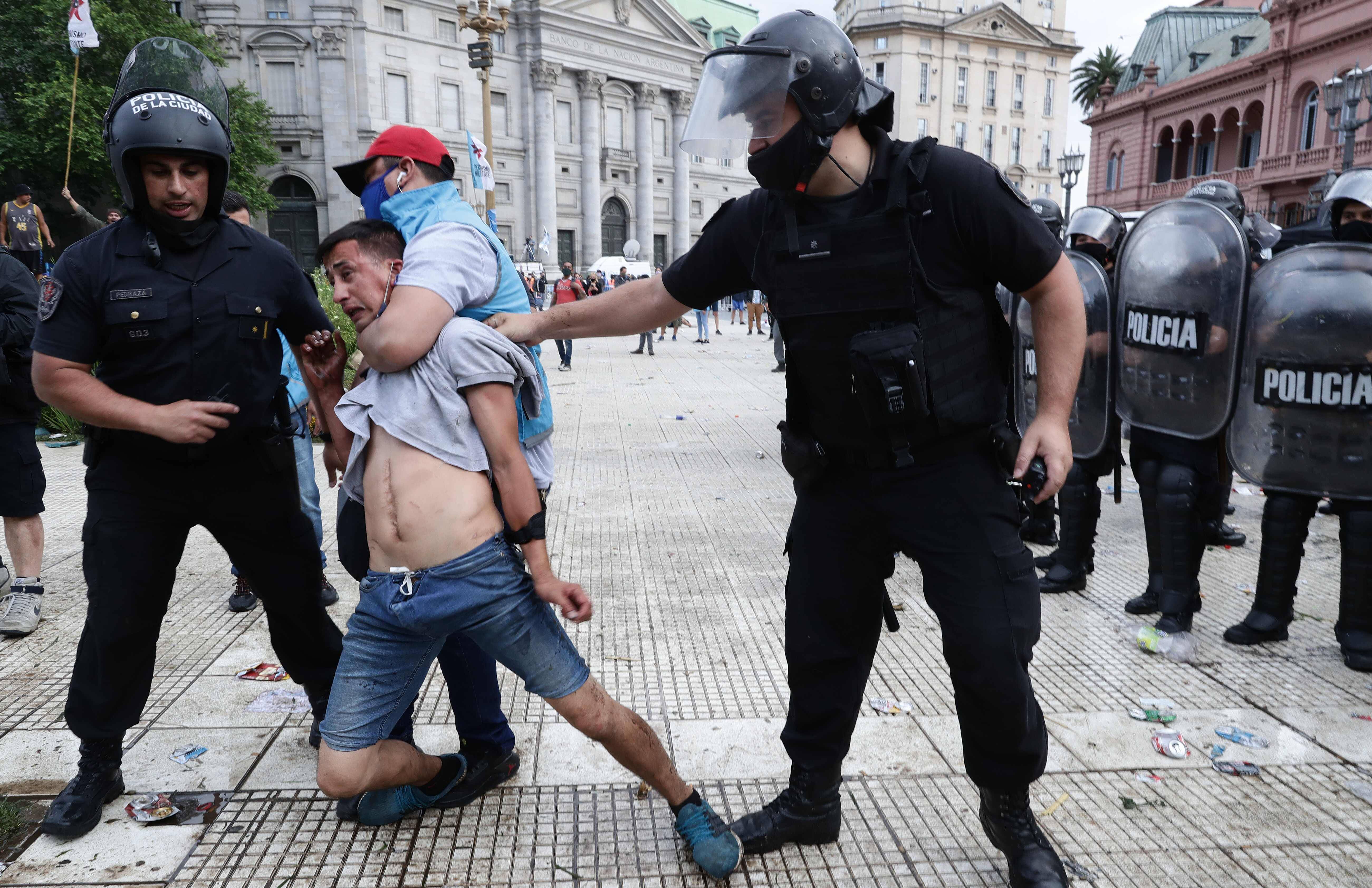 >>>当地时间26日下午,正在阿根廷首都布宜诺斯艾利斯总统府举行的该国传奇球星迭戈·马拉多纳的告别仪式中发生多起暴力事件,一群马拉多纳的球迷高喊口号强行进入玫瑰宫,引发现场混乱,警方已进驻现场维持秩序。为了安全起见,工作人员已经把马拉多纳的木棺搬离现场,将被运往布宜诺斯艾利斯市市郊下葬,原定于19时结束的遗体告别仪式提前结束。