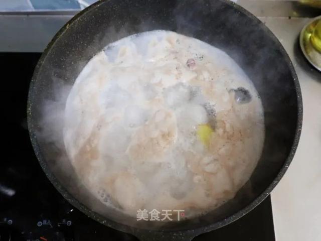 12. 加料酒1勺,白胡椒粉1-2勺调味,最后淋一丁点米醋,水开后关火。