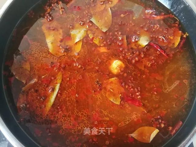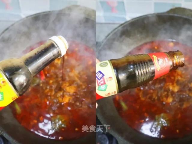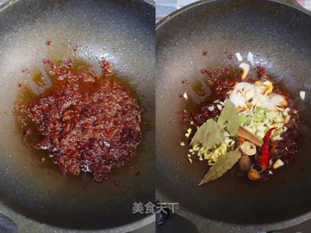 9. 锅洗干净,放入适量的油,放豆瓣酱炸出红油,加葱姜蒜大料炒出香味。