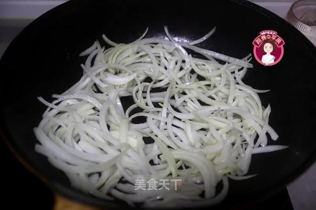 4. 炒锅中倒适量油,油温7、8成时,将洋葱丝入锅翻炒2分钟,洋葱边上有微黄但是整体还是脆的时候盛出备用。