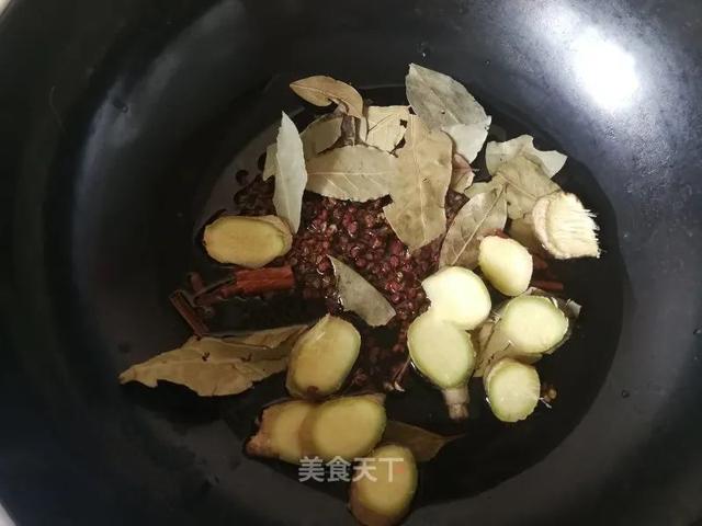 3. 锅内适量油烧热,姜片,花椒,香叶,桂皮,冰糖(冰糖忘放了,)炒香。