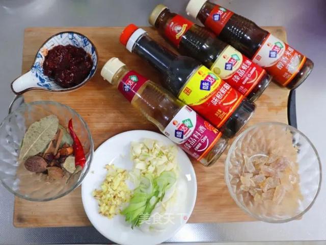 3. 准备配料,葱姜蒜切碎,冰糖秤好克数,郫县豆瓣酱两勺,大料放在一起(红辣椒,草果,香砂,香叶,花椒,八角,丁香,桂皮,甘草)料酒,味极鲜酱油,蚝油,米醋。