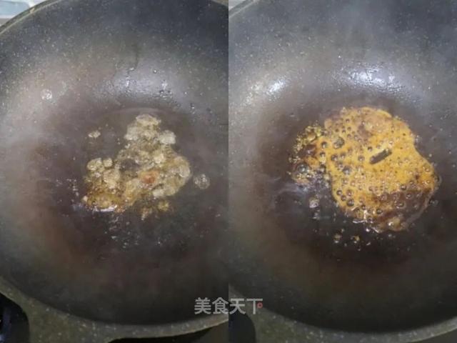 7. 锅中加入少量的油,放冰糖,中小火,冰糖融化后,起黄色小细泡泡。