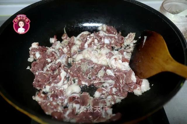 5. 同锅再倒适量油,锅是热的,油是凉的,将羊肉片倒入锅中,用铲子尖迅速将羊肉划撒,一定是趁着油未时划,待油温上来了,羊肉就粘连在一起成坨难分开了。