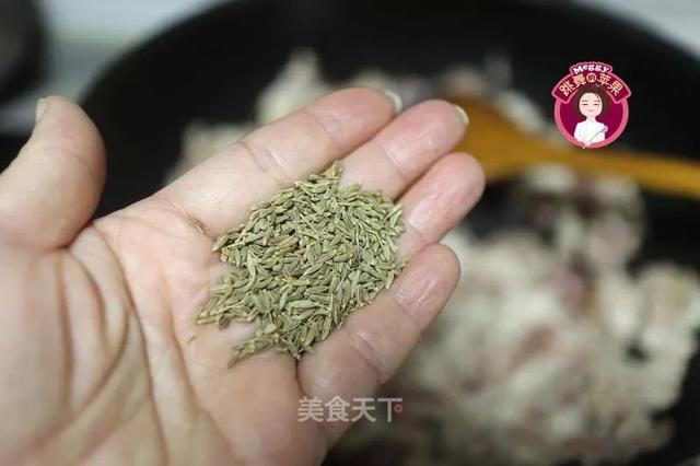 8. 加入孜然粒5g、孜然粉5g和盐3g翻炒均匀。