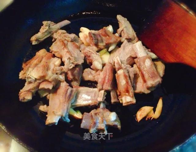 6. 炒锅中火烧至掌心灼热后倒入花生油10ml,转大火烧至油热后放入切好的大蒜,煎出香味后放入炖好的羊排,小火慢慢的煎。