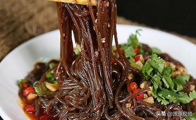 6.将蕨根粉装入盘中,浇上前面调好的酱汁,淋上油辣椒,最后撒上香菜,拌匀即可