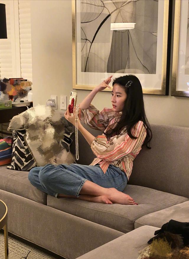 在颜色的选择上面,刘亦菲经常会选择一些比较浅的色调,条纹衬衫综合了好几个,低调又温婉的色彩,虽然在色系上面没有很显眼,可是组合后看上去有一种非常自然的效果。竖向的条纹也可以在视觉上修饰身形显得人更加的苗条。下身用蓝色的牛仔裤搭配,将完美的比例显现,更显青春减龄。